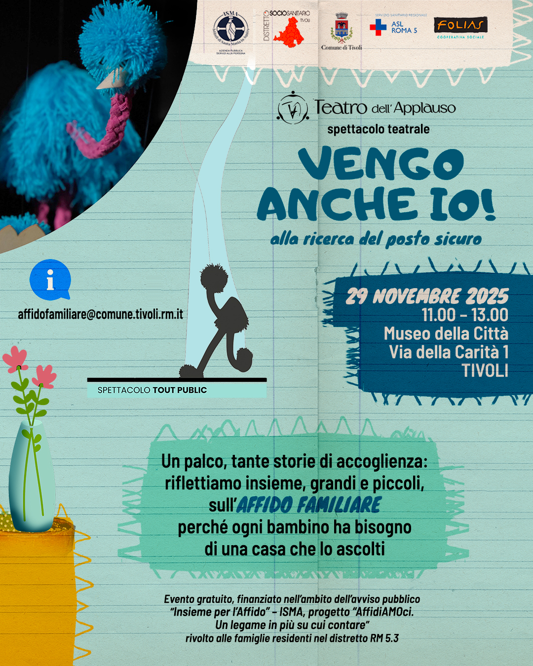 🎠Apre l’evento lo spettacolo teatrale “VENGO ANCHE IO! alla ricerca del posto sicuro” a cura del **Teatro Dell’Applauso**: una performance emozionante che ci aiuterà a entrare nel cuore del tema.